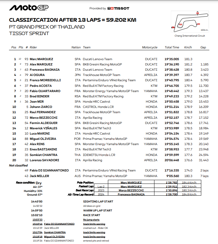 昨日開催された2025年MOTOGP第1戦タイラウンドTissotSprint。13周で行われたレースのダイジェスト動画が公開されました。第1戦を制したのは、ポールポジションの#93マルク・マルケス!小椋藍選手は5番手からスタートし、第1右コーナーで4番手スタートだったヤマハのジャック・ミラー選手をかくっと外からパス!(このシーンカッコいいです)そのまま4位をキープ!一時はバニャイヤ選手を突っつきそうな勢いも感じさせる走りで、とんでもないデビューレースを見せてくれました!大興奮!!!