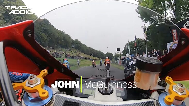 RACEマン島のレジェンドライダー、ジョン・マクギネス選手によるパレードラップ。マシンはホンダVTR1000 SP-1。イギリスはスカボローにある<Oliver’s Mount Racingサーキット>で開かれたもの。凄い音!