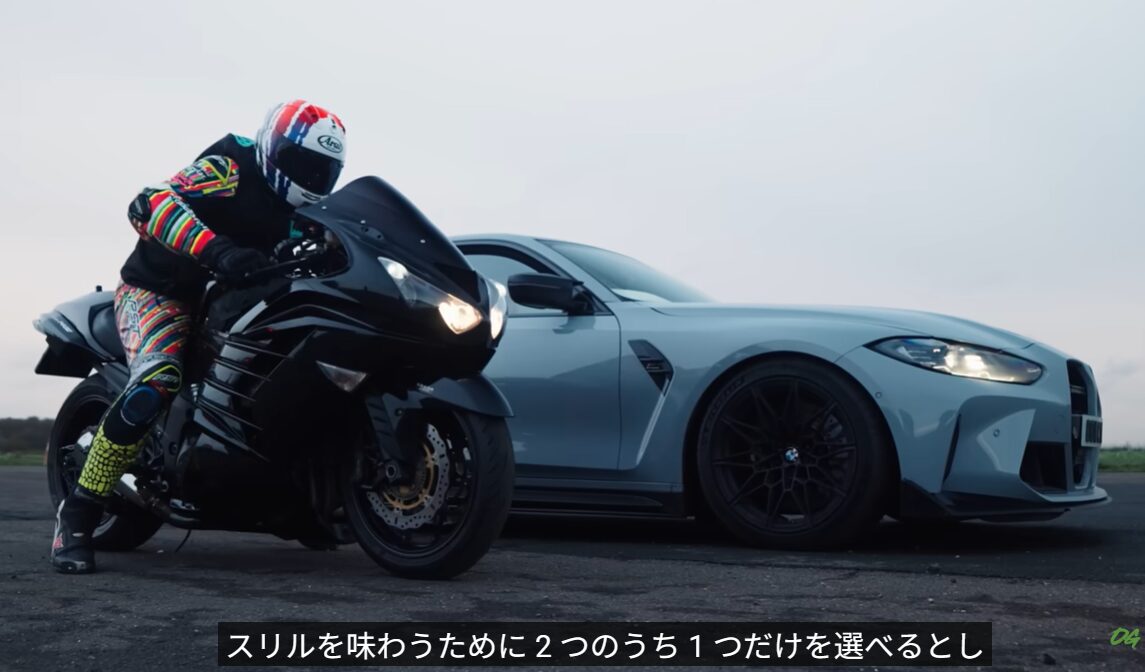 OFFICIALLY GASSED – OGチャンネルさんから。380馬力のスーパーチャージャー付きNinja ZX-14R対900馬力のBMW G80 M3!最初は調子よかったんですけど・・・。でも4輪相手ですからね、スゴイです!!!