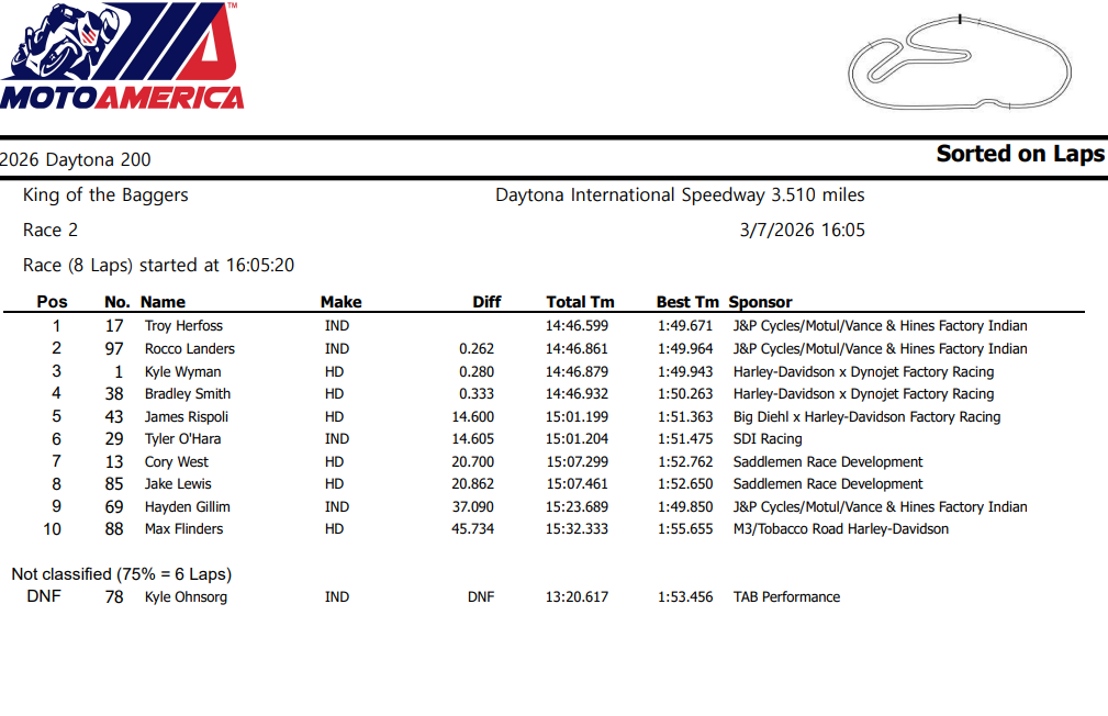 2026年3月7日ミッション・キング・オブ・バガーズ”デイトナ200”レース2のダイジェスト動画が公開。スタート順はレース1と一緒。トロイ・ハーフォス(バンス&ハインズ・インディアン)選手とチームメイトのヘイデン・ギリム選手、ロッコ・ランダース選手、前年王者ハーレーダビッドソン、カイル・ワイマン選手と元MOTOGPレーサー、ブラッドリー・スミスによるバトルが展開。インディアンワークスvsハーレーワークスの戦いでもありました。