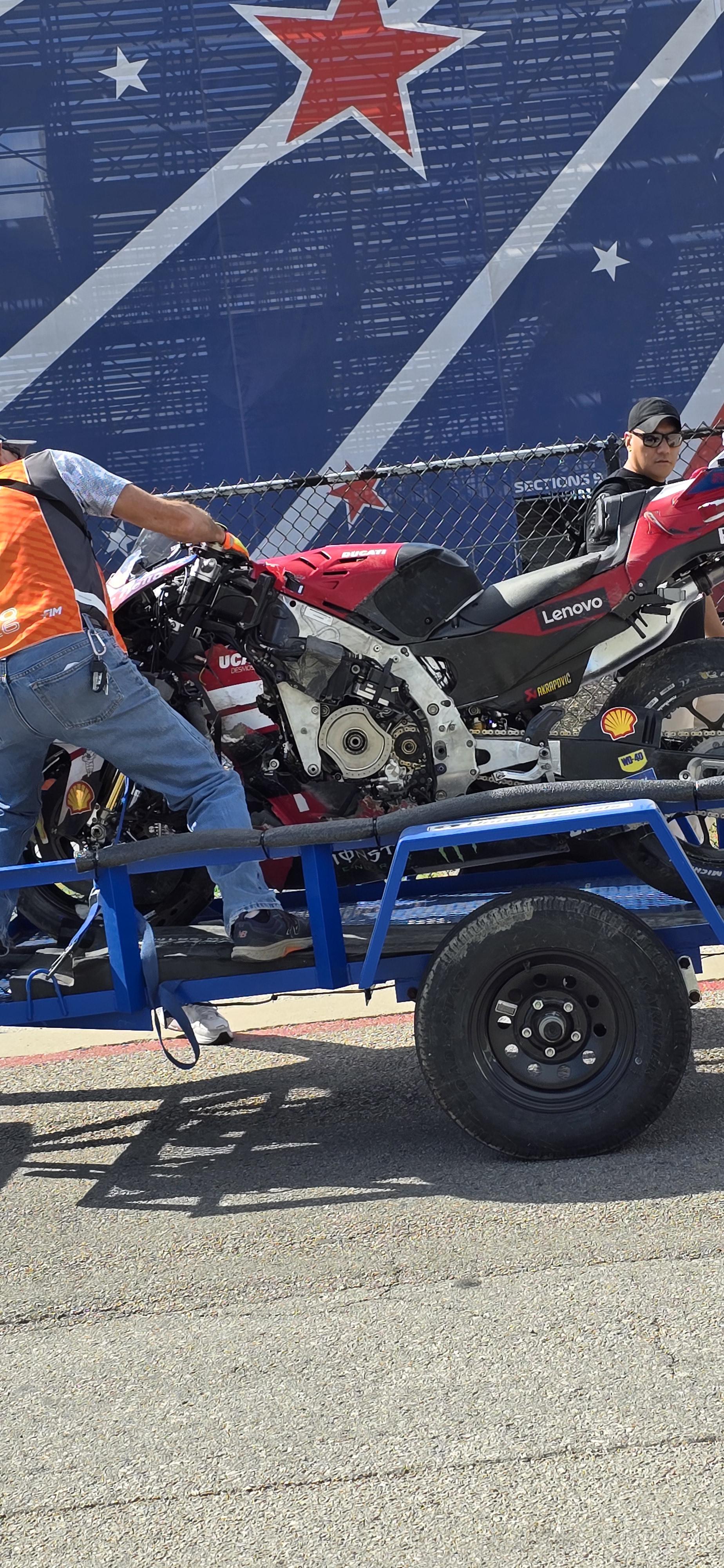 MOTOGP第3戦アメリカラウンドFP1、ターン10時(4周目?)速185㎞でクラッシュしたマルク・マルケス。大きな転倒だったものの、怪我はなくその後4番手でフィニッシュ。小椋選手は8番手。トップはペドロ・アコスタでファステストラップを出しました。
